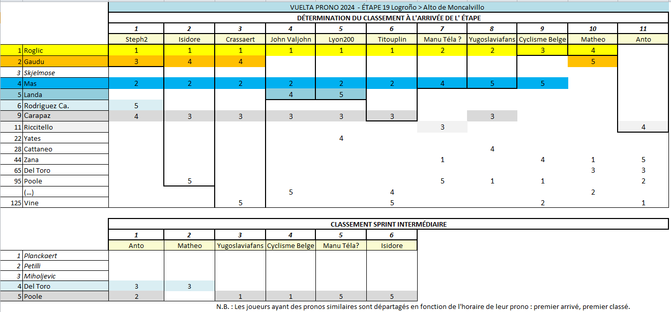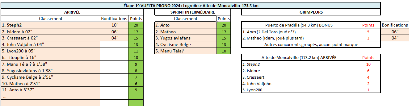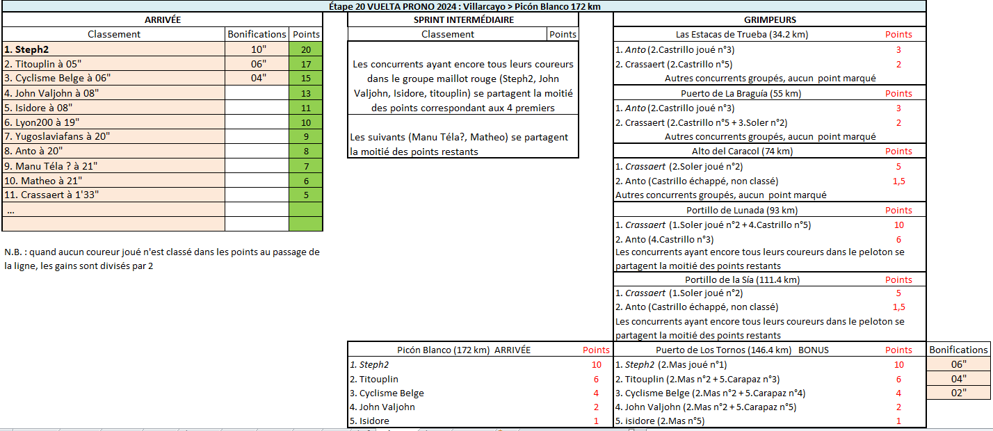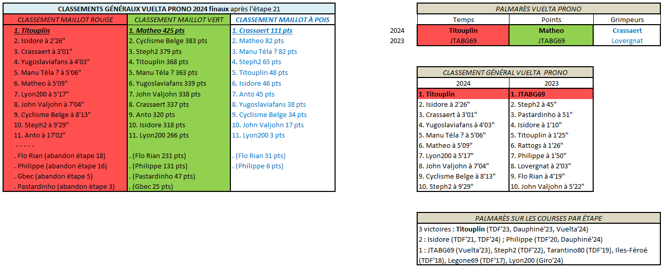 25. Arrivée provisoire Vuelta Prono 1. Steph2 2. Isidore à 02" 3. Crassaert à 02" 4. John Valjohn à 04" 5. Lyon200 à 05" 6. Titouplin à 16" 7. Manu Téla ? à 1'38" 8. Yugoslaviafans à 1'38" 9. Cyclisme Belge à 2'51" 10. Matheo à 2'51" 11. Anto à 3'37" Manu Téla? a craqué sur cette ascension finale, Titouplin va reprendre le maillot rouge !