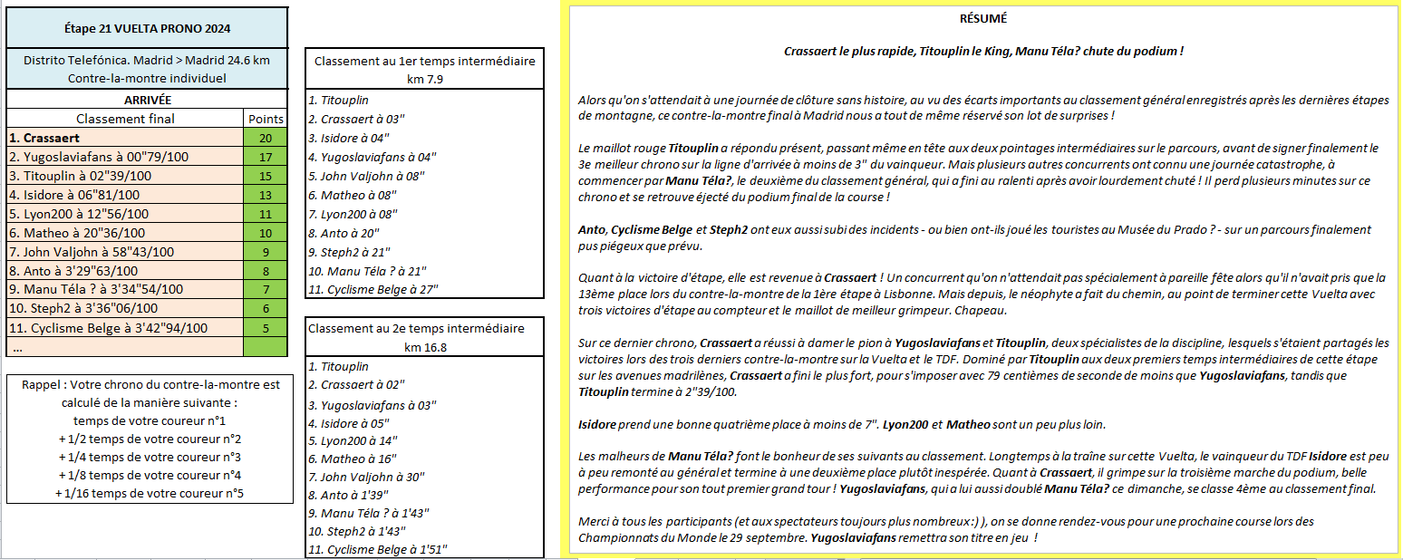 12. VUELTA PRONO Crassaert le plus rapide, Titouplin le King, Manu Téla? chute du podium ! Alors qu'on s'attendait à une journée de clôture sans histoire, au vu des écarts importants au classement général enregistrés après les dernières étapes de montagne, ce contre-la-montre final à Madrid nous a tout de même réservé son lot de surprises ! Le maillot rouge Titouplin a répondu présent, passant même en tête aux deux pointages intermédiaires sur le parcours, avant de signer finalement le 3e meilleur chrono sur la ligne d'arrivée à moins de 3" du vainqueur. Mais plusieurs autres concurrents ont connu une journée catastrophe, à commencer par Manu Téla?, le deuxième du classement général, qui a fini au ralenti après avoir lourdement chuté ! Il perd plusieurs minutes sur ce chrono et se retrouve éjecté du podium final de la course ! Anto, Cyclisme Belge et Steph2 ont eux aussi subi des incidents - ou bien ont-ils joué les touristes au Musée du Prado ? - sur un parcours finalement plus piégeux que prévu. Quant à la victoire d'étape, elle est revenue à Crassaert ! Un concurrent qu'on n'attendait pas spécialement à pareille fête alors qu'il n'avait pris que la 13ème place lors du contre-la-montre de la 1ère étape à Lisbonne. Mais depuis, le néophyte a fait du chemin, au point de terminer cette Vuelta avec trois victoires d'étape au compteur et le maillot de meilleur grimpeur. Chapeau. Sur ce dernier chrono, Crassaert a réussi à damer le pion à Yugoslaviafans et Titouplin, deux spécialistes de la discipline, lesquels s'étaient partagés les victoires lors des trois derniers contre-la-montre sur la Vuelta et le TDF. Dominé par Titouplin aux deux premiers temps intermédiaires de cette étape sur les avenues madrilènes, Crassaert a fini le plus fort, pour s'imposer avec 79 centièmes de seconde de moins que Yugoslaviafans, tandis que Titouplin termine à 2"39/100. Isidore prend une bonne quatrième place à moins de 7". Lyon200 et Matheo sont un peu plus loin. Les malheurs de Manu Téla? font le bonheur de ses suivants au classement. Longtemps à la traîne sur cette Vuelta, le vainqueur du TDF Isidore est peu à peu remonté au général et termine à une deuxième place plutôt inespérée. Quant à Crassaert, il grimpe sur la troisième marche du podium, belle performance pour son tout premier grand tour ! Yugoslaviafans, qui a lui aussi doublé Manu Téla? ce dimanche, se classe 4ème au classement final. Merci à tous les participants (et aux spectateurs toujours plus nombreux ), on se donne rendez-vous pour une prochaine course lors des Championnats du Monde le 29 septembre. Yugoslaviafans remettra son titre en jeu !