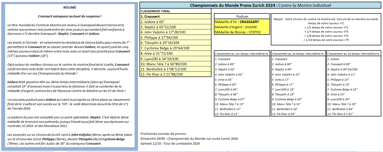 4. Crassaert vainqueur au bout du suspense ! Le titre mondial du Contre la Montre est revenu à Evenepoel devant Ganna et la victoire aux pronos s'est jouée entre les trois joueurs qui avaient fait confiance à Ganna en n°2 derrière Evenepoel : Steph2, Crassaert et Isidore. Les écarts à l'arrivée - et notamment la résistance de Ganna battu pour moins de 7" - permettent à Crassaert de se classer premier devant Isidore, en ayant joué les cinq mêmes coureurs dans le même ordre mais avec un écart plus proche pour Crassaert (13") que pour Isidore (16"). Déjà auteur du meilleur chrono sur le contre-la-montre final de la Vuelta, Crassaert confirme donc avec éclat son talent dans cette discipline, il déroche aujourd'hui la médaille d'or sur ces Championnats du Monde ! Isidore était passé en tête au 3ème temps intermédiaire (alors qu'Evenepoel comptait 19" d'avance) mais n'a pas tenu la distance. il doit se contenter de la médaille d'argent, comme lors de l'épreuve Contre-la-Montre sur les JO de Paris ! Un nouveau podium pour Isidore qui vient aussi après sa 2ème place au classement final de la Vuelta et son succès sur le TDF : le voilà désormais assuré du titre de n°1 de l'année 2024. Le podium du jour est complété par un autre spécialiste, Steph2. C'est déjà la 3ème médaille de bronze à son palmarès, puisqu'il avait aussi fait 3ème aux épreuves sur route des JO 2024 et des Mondiaux 2021. Les accessits sur ce chrono de Zurich vont à John Valjohn (4ème, après sa 5ème place sur le chrono des JO) et Philippe (5ème), devant Titouplin (6e) et Cyclisme Belge (7ème). Les autres ont fini à plus de 30" du vainqueur Crassaert.