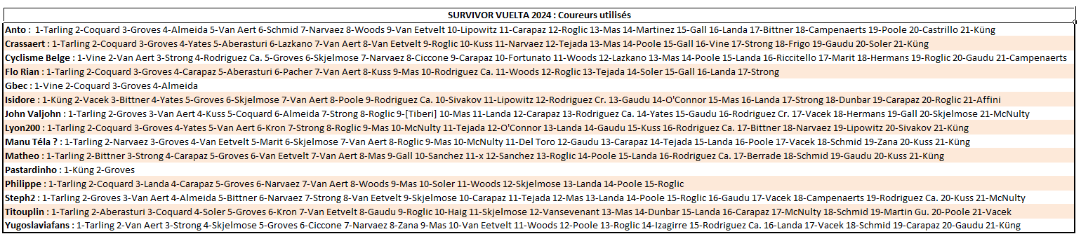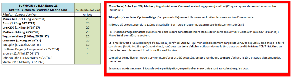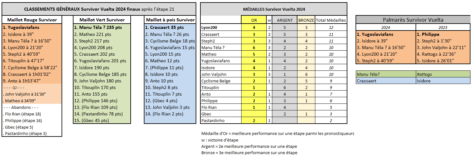 14. SURVIVOR VUELTA Manu Téla?, Anto, Lyon200, Matheo, Yugoslaviafans et Crassaert avaient la gagne aujourd'hui (Küng vainqueur de ce contre-la-montre individuel ) ! Titouplin (Vacek 6e) et Cyclisme Belge (Campenaerts 7e) sauvent l'honneur en limitant la casse à moins d'une minute. Isidore a dû se contenter de la 12ème place (Affini) et il perd in extremis la 1ère place du classement général ! Félicitations à Yugoslaviafans qui renverse donc Isidore sur cette dernière étape et remporte ce Survivor Vuelta 2024 (avec 39" d'avance) ! Manu Téla? complète le podium. Et le maillot vert a lui aussi changé d'épaules aujourd'hui ! Steph2 - qui menait le classement par points Survivor depuis la 3ème étape - a foiré son chrono (McNulty 113e après avoir chuté, joué aussi par John Valjohn) et il abandonne la 1ère place au profit de Manu Téla? ! Matheo se classe 2ème au classement final du maillot vert Survivor. Le maillot de meilleur grimpeur Survivor était d'ores et déjà acquis à Crassaert, tandis que Lyon200 s'adjuge la 1ère place au classement des médailles. Bravo aux lauréats et merci à tous de votre participation, en particulier à ceux qui se sont accrochés jusqu'au bout.