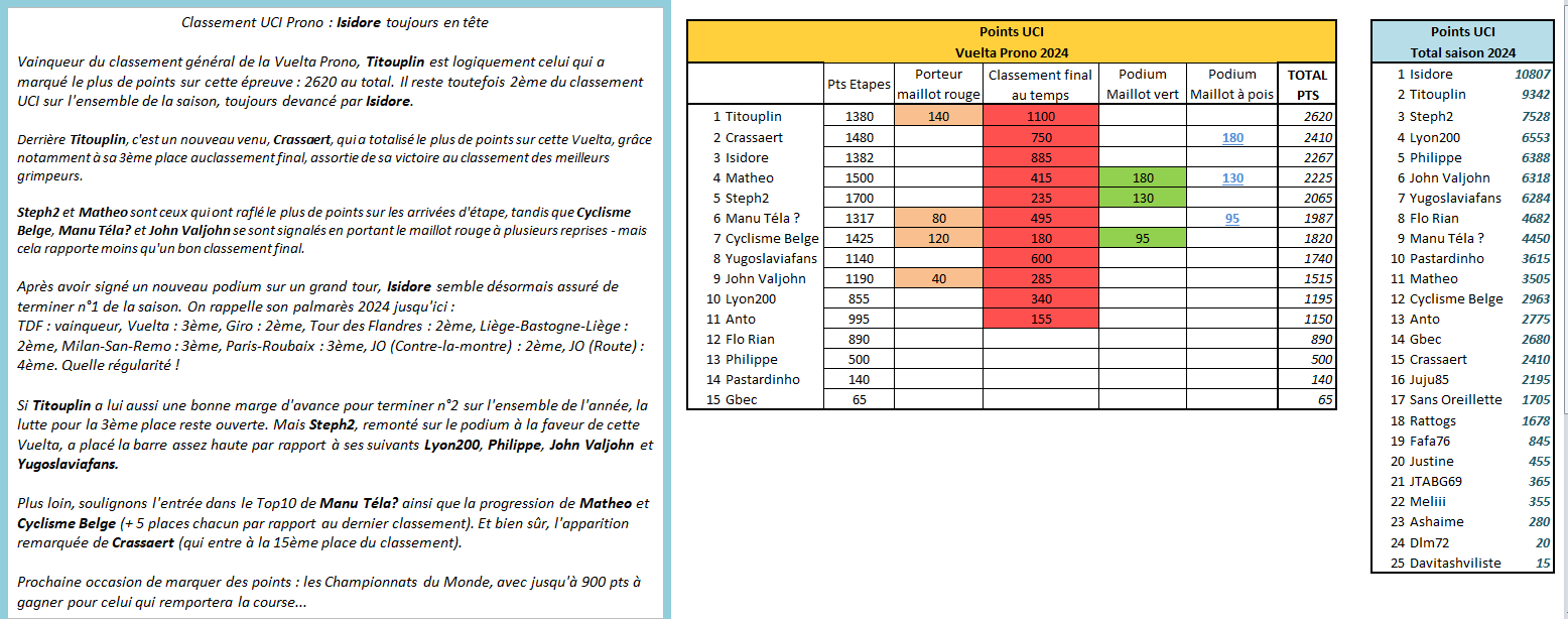 11. Classement UCI Prono : Isidore toujours en tête Vainqueur du classement général de la Vuelta Prono, Titouplin est logiquement celui qui a marqué le plus de points sur cette épreuve : 2620 au total. Il reste toutefois 2ème du classement UCI sur l'ensemble de la saison, toujours devancé par Isidore. Derrière Titouplin, c'est un nouveau venu, Crassaert, qui a totalisé le plus de points sur cette Vuelta, grâce notamment à sa 3ème place auclassement final, assortie de sa victoire au classement des meilleurs grimpeurs. Steph2 et Matheo sont ceux qui ont raflé le plus de points sur les arrivées d'étape, tandis que Cyclisme Belge, Manu Téla? et John Valjohn se sont signalés en portant le maillot rouge à plusieurs reprises - mais cela rapporte moins qu'un bon classement final. Après avoir signé un nouveau podium sur un grand tour, Isidore semble désormais assuré de terminer n°1 de la saison. On rappelle son palmarès 2024 jusqu'ici : TDF : vainqueur, Vuelta : 3ème, Giro : 2ème, Tour des Flandres : 2ème, Liège-Bastogne-Liège : 2ème, Milan-San-Remo : 3ème, Paris-Roubaix : 3ème, JO (Contre-la-montre) : 2ème, JO (Route) : 4ème. Quelle régularité ! Si Titouplin a lui aussi une bonne marge d'avance pour terminer n°2 sur l'ensemble de l'année, la lutte pour la 3ème place reste ouverte. Mais Steph2, remonté sur le podium à la faveur de cette Vuelta, a placé la barre assez haute par rapport à ses suivants Lyon200, Philippe, John Valjohn et Yugoslaviafans. Plus loin, soulignons l'entrée dans le Top10 de Manu Téla? ainsi que la progression de Matheo et Cyclisme Belge (+ 5 places chacun par rapport au dernier classement). Et bien sûr, l'apparition remarquée de Crassaert (qui entre à la 15ème place du classement). Prochaine occasion de marquer des points : les Championnats du Monde, avec jusqu'à 900 pts à gagner pour celui qui remportera la course...