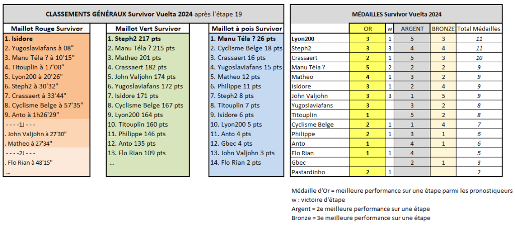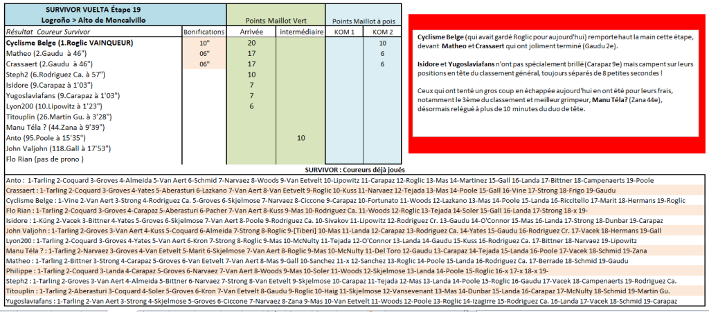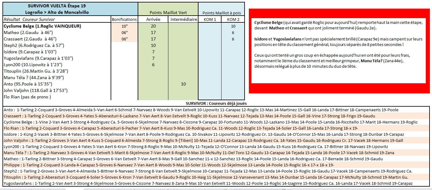 19. SURVIVOR VUELTA La meilleure performance du jour est pour Isidore, le leader du classement général. Il s'était offert le luxe de garder Roglic jusqu'ici (et se classe 3e sur cette étape) ! Le gain n'est toutefois pas énorme sur cette étape par rapport à Yugoslaviafans et Cyclisme Belge (Gaudu 7e à 11" de Roglic) ou même John Valjohn (Skjelmose 10e à 26" de Roglic). À la veille de la dernière étape, Isidore conforte sa position, mais son second Yugoslaviafans ne compte que 23" de retard avant le contre-la-montre final ce dimanche ! Par contre, le 3e Manu Téla? (Kuss aujourd'hui) pointe désormais à 17'13"...et il a perdu son maillot à pois. C'est Crassaert qui sera sacré meilleur grimpeur Survivor de cette Vuelta (merci Soler) ! Pour le maillot vert, le suspense reste de mise entre Steph2 et Manu Téla?, voire Matheo...