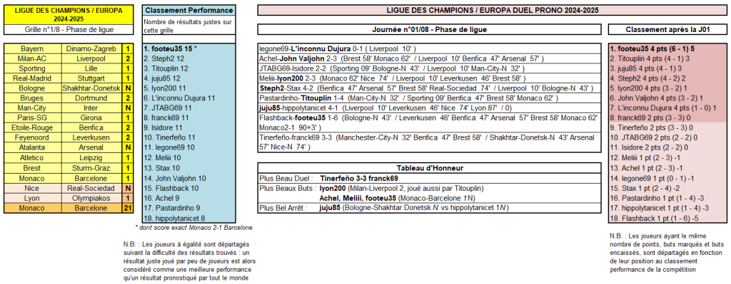 1. Félicitations à footeu35 qui a survolé cette première grille européenne, avec 14 résultats 1N2 justes + le score exact de Monaco-Barcelone ! Très loin au-dessus des autres meilleurs performeurs de cette grille, Steph2, Titouplin et juju85 (12/16). footeu35 en profite pour cartonner Flashback en duel et prendre la 1ère place à la différence de buts au classement de cette phase de ligue après cette première journée. Finaliste de la Ligue des Champions Duel Prono en 2021 et en 2023, footeu35 sera encore l'un des favoris cette saison ! Le tenant du titre hippolytanicet a en revanche mal débuté, largement battu par juju85. P.S. : Si d'autres joueurs veulent débuter le jeu à l'occasion de la J02, n'hésitez pas à nous rejoindre ! Ci-dessous les résultats détaillés de cette première grille de la phase de ligue (cliquez sur l'image pour visualiser plein écran)