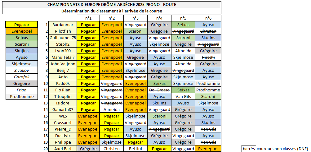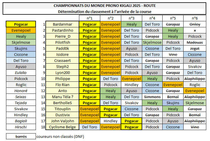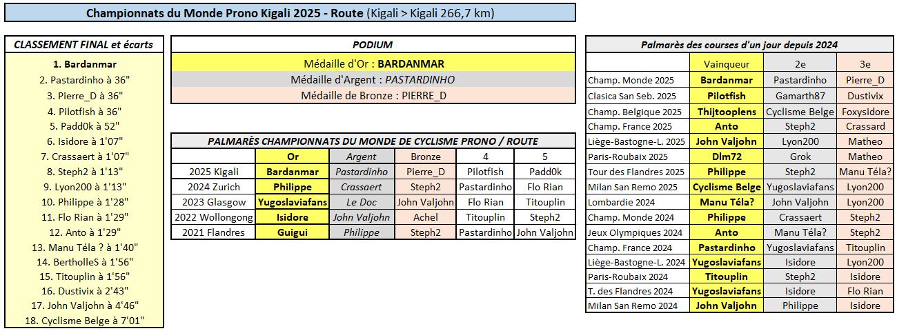 Bardanmar remet ça ! Huit jours après les mondiaux, il triomphe encore aujourd'hui (Pogacar n°1 + Evenepoel n°2 + Seixas n°5). Pilotfish (grâce à Scaroni n°3) et Guillaume_78 (Scaroni n°5) complètent le podium, devant Steph2 et Lyon200