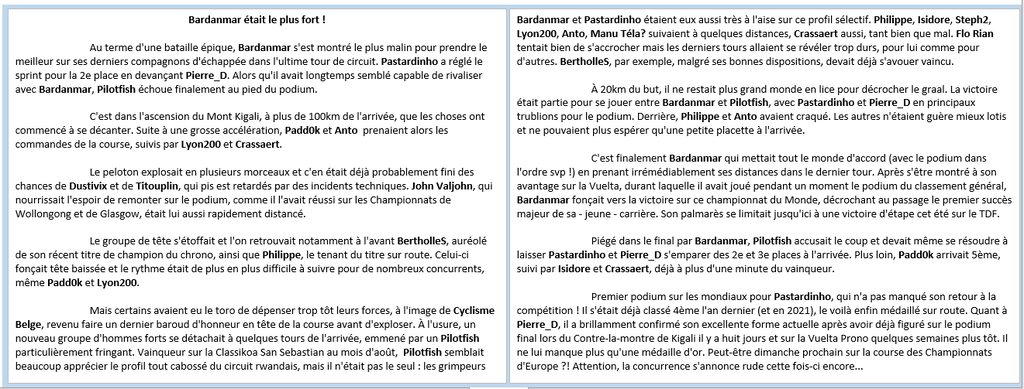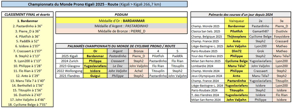Bardanmar était le plus fort ! Au terme d'une bataille épique, Bardanmar s'est montré le plus malin pour prendre le meilleur sur ses derniers compagnons d'échappée dans l'ultime tour de circuit. Pastardinho a réglé le sprint pour la 2e place en devançant Pierre_D. Alors qu'il avait longtemps semblé capable de rivaliser avec Bardanmar, Pilotfish échoue finalement au pied du podium. C'est dans l'ascension du Mont Kigali, à plus de 100km de l'arrivée, que les choses ont commencé à se décanter. Suite à une grosse accélération, Padd0k et Anto prenaient alors les commandes de la course, suivis par Lyon200 et Crassaert. Le peloton explosait en plusieurs morceaux et c'en était déjà probablement fini des chances de Dustivix et de Titouplin, qui pis est retardés par des incidents techniques. John Valjohn, qui nourrissait l'espoir de remonter sur le podium, comme il l'avait réussi sur les Championnats de Wollongong et de Glasgow, était lui aussi rapidement distancé. Le groupe de tête s'étoffait et l'on retrouvait notamment à l'avant BertholleS, auréolé de son récent titre de champion du chrono, ainsi que Philippe, le tenant du titre sur route. Celui-ci fonçait tête baissée et le rythme était de plus en plus difficile à suivre pour de nombreux concurrents, même Padd0k et Lyon200. Mais certains avaient eu le toro de dépenser trop tôt leurs forces, à l'image de Cyclisme Belge, revenu faire un dernier baroud d'honneur en tête de la course avant d'exploser. À l'usure, un nouveau groupe d'hommes forts se détachait à quelques tours de l'arrivée, emmené par un Pilotfish particulièrement fringant. Vainqueur sur la Classikoa San Sebastian au mois d'août, Pilotfish semblait beaucoup apprécier le profil tout cabossé du circuit rwandais, mais il n'était pas le seul : les grimpeurs Bardanmar et Pastardinho étaient eux aussi très à l'aise sur ce profil sélectif. Philippe, Isidore, Steph2, Lyon200, Anto, Manu Téla? suivaient à quelques distances, Crassaert aussi, tant bien que mal. Flo Rian tentait bien de s'accrocher mais les derniers tours allaient se révéler trop durs, pour lui comme pour d'autres. BertholleS, par exemple, malgré ses bonnes dispositions, devait déjà s'avouer vaincu. À 20km du but, il ne restait plus grand monde en lice pour décrocher le Graal. La victoire était partie pour se jouer entre Bardanmar et Pilotfish, avec Pastardinho et Pierre_D en principaux trublions pour le podium. Derrière, Philippe et Anto avaient craqué. Les autres n'étaient guère mieux lotis et ne pouvaient plus espérer qu'une petite placette à l'arrivée. C'est finalement Bardanmar qui mettait tout le monde d'accord (avec le podium dans l'ordre svp !) en prenant irrémédiablement ses distances dans le dernier tour. Après s'être montré à son avantage sur la Vuelta, durant laquelle il avait joué pendant un moment le podium du classement général, Bardanmar fonçait vers la victoire sur ce championnat du Monde, décrochant au passage le premier succès majeur de sa - jeune - carrière. Son palmarès se limitait jusqu'ici à une victoire d'étape cet été sur le TDF. Piégé dans le final par Bardanmar, Pilotfish accusait le coup et devait même se résoudre à laisser Pastardinho et Pierre_D s'emparer des 2e et 3e places à l'arrivée. Plus loin, Padd0k arrivait 5ème, suivi par Isidore et Crassaert, déjà à plus d'une minute du vainqueur. Premier podium sur les mondiaux pour Pastardinho, qui n'a pas manqué son retour à la compétition ! Il s'était déjà classé 4ème l'an dernier (et en 2021), le voilà enfin médaillé sur route. Quant à Pierre_D, il a brillamment confirmé son excellente forme actuelle après avoir déjà figuré sur le podium final lors du Contre-la-montre de Kigali il y a huit jours et sur la Vuelta Prono quelques semaines plus tôt. Il ne lui manque plus qu'une médaille d'or. Peut-être dimanche prochain sur la course des Championnats d'Europe ?! Attention, la concurrence s'annonce rude cette fois-ci encore...