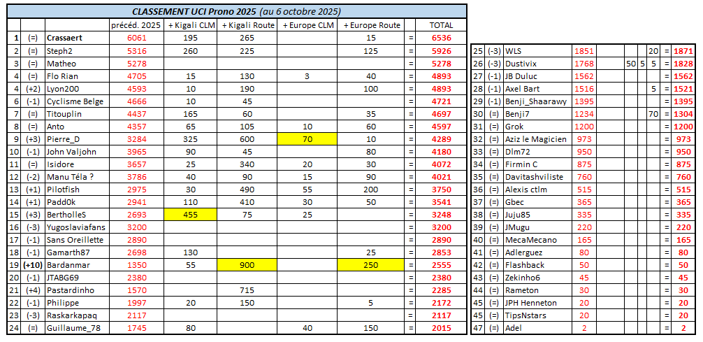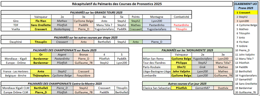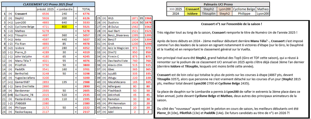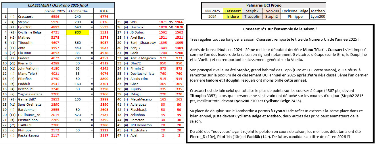 Très régulier tout au long de la saison, Crassaert remporte le titre de Numéro Un de l'année 2025 ! Après de bons débuts en 2024 - 2ème meilleur débutant derrière Manu Téla? -, Crassaert s'est imposé comme l'un des leaders de la saison en signant notamment 6 victoires d'étape (sur le Giro, le Dauphiné et la Vuelta) et en remportant le classement général sur la Vuelta. Son principal rival aura été Steph2, grand habitué des Top5 (Giro et TDF cette saison), qui a réussi à remonter sur le podium de ce classement UCI annuel en 2025 après s'être déjà classé 3ème l'an dernier (derrière Isidore et Titouplin, lesquels ont moins brillé cette année). Crassaert est de loin celui qui totalise le plus de points sur les courses à étape (4867 pts, devant Titouplin 3357), alors que personne ne s'est vraiment détaché sur les courses d'un jour (Steph2 2815 pts, meilleur total devant Lyon200 2700 et Cyclisme Belge 2435). Sa place de dauphin sur le Lombardie a permis à Lyon200 de rafler in extremis la 3ème place dans ce bilan annuel, juste devant Cyclisme Belge et Matheo, deux autres des principaux animateurs de la saison. Du côté des "nouveaux" ayant rejoint le peloton en cours de saison, les meilleurs débutants ont été Pierre_D (10e), Pilotfish (13e) et Padd0k (14e). De futurs candidats au titre de n°1 en 2026 ?! Encore merci à tous ceux qui ont joué durant cette saison, nouveau record de participation. On tâchera de faire encore mieux l'année prochaine 🙂
