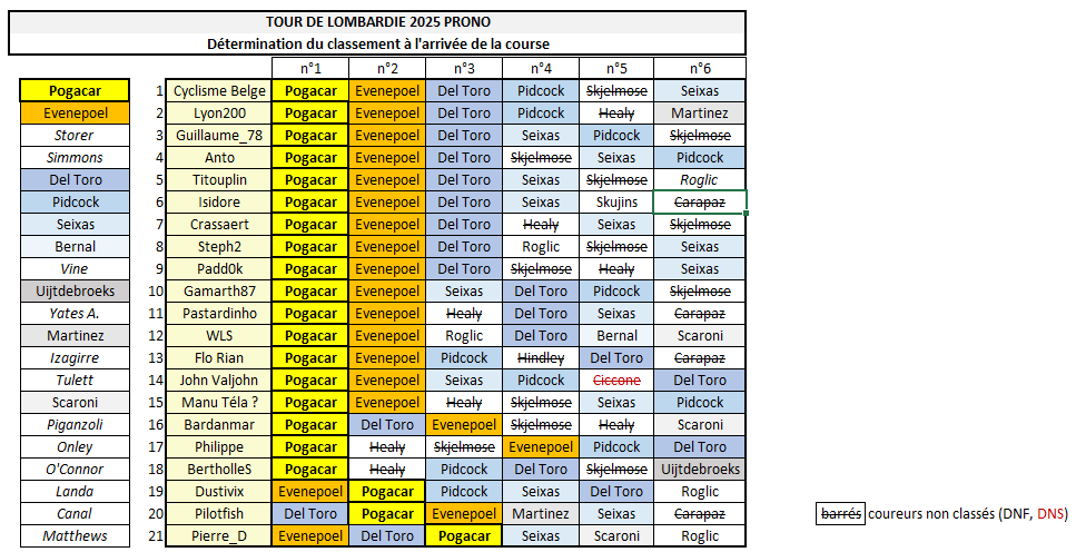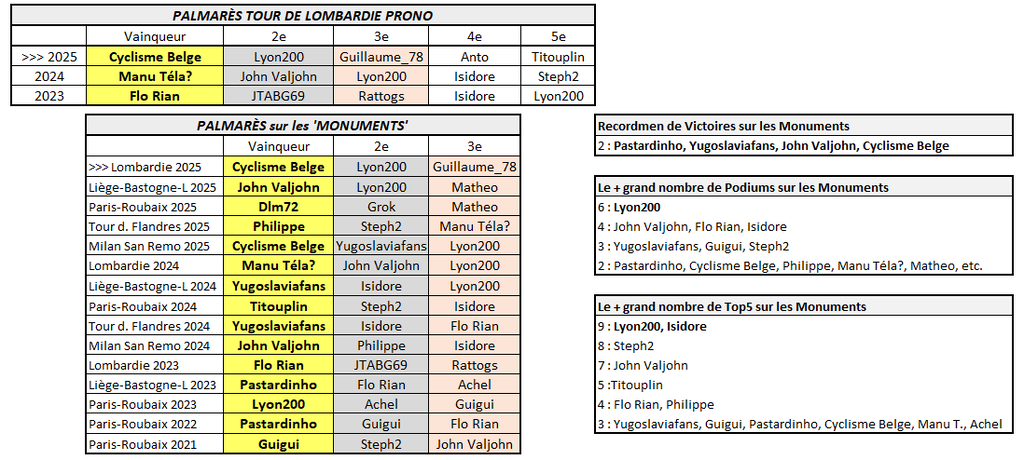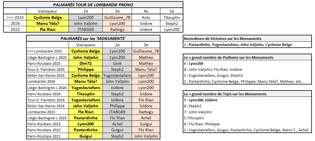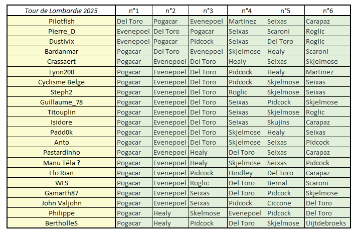 Cyclisme Belge remporte son 2e Monument (après sa victoire sur Milan San Remo en début d'année) ! Il s'impose au sprint (Pogacar n°1 + Evenepoel n°2 + Del Toro n°3 + Pidcock n°4 + Seixas) devant Lyon200 et Guillaume_78. Le Top 10 : 1 Cyclisme Belge 2 Lyon200 3 Guillaume_78 4 Anto 5 Titouplin 6 Isidore 7 Crassaert 8 Steph2 9 Padd0k 10 Gamarth87 (tous dans le même temps) plus loin 11 Pastardinho 12 WLS 13 Flo Rian 14 John Valjohn etc.