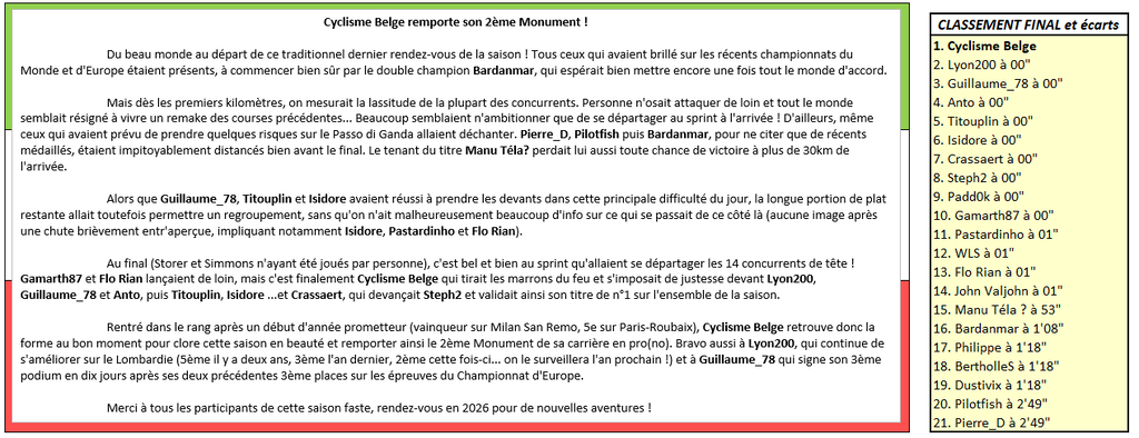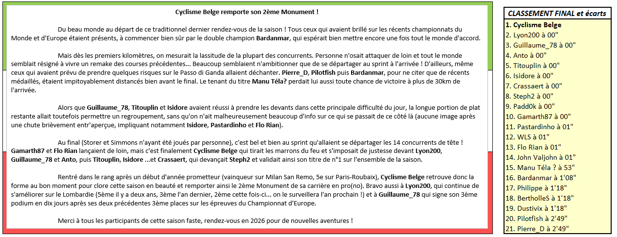 Cyclisme Belge remporte son 2ème Monument ! Du beau monde au départ de ce traditionnel dernier rendez-vous de la saison ! Tous ceux qui avaient brillé sur les récents championnats du Monde et d'Europe étaient présents, à commencer bien sûr par le double champion Bardanmar, qui espérait bien mettre encore une fois tout le monde d'accord. Mais dès les premiers kilomètres, on mesurait la lassitude de la plupart des concurrents. Personne n'osait attaquer de loin et tout le monde semblait résigné à vivre un remake des courses précédentes... Beaucoup semblaient n'ambitionner que de se départager au sprint à l'arrivée ! D'ailleurs, même ceux qui avaient prévu de prendre quelques risques sur le Passo di Ganda allaient déchanter. Pierre_D, Pilotfish puis Bardanmar, pour ne citer que de récents médaillés, étaient impitoyablement distancés bien avant le final. Le tenant du titre Manu Téla? perdait lui aussi toute chance de victoire à plus de 30km de l'arrivée. Alors que Guillaume_78, Titouplin et Isidore avaient réussi à prendre les devants dans cette principale difficulté du jour, la longue portion de plat restante allait toutefois permettre un regroupement, sans qu'on n'ait malheureusement beaucoup d'info sur ce qui se passait de ce côté là (aucune image après une chute brièvement entr'aperçue, impliquant notamment Isidore, Pastardinho et Flo Rian). Au final (Storer et Simmons n'ayant été joués par personne), c'est bel et bien au sprint qu'allaient se départager les 14 concurrents de tête ! Gamarth87 et Flo Rian lançaient de loin, mais c'est finalement Cyclisme Belge qui tirait les marrons du feu et s'imposait de justesse devant Lyon200, Guillaume_78 et Anto, puis Titouplin, Isidore ...et Crassaert, qui devançait Steph2 et validait ainsi son titre de n°1 sur l'ensemble de la saison. Rentré dans le rang après un début d'année prometteur (vainqueur sur Milan San Remo, 5e sur Paris-Roubaix), Cyclisme Belge retrouve donc la forme au bon moment pour clore cette saison en beauté et remporter ainsi le 2ème Monument de sa carrière en pro(no). Bravo aussi à Lyon200, qui continue de s'améliorer sur le Lombardie (5ème il y a deux ans, 3ème l'an dernier, 2ème cette fois-ci... on le surveillera l'an prochain !) et à Guillaume_78 qui signe son 3ème podium en dix jours après ses deux précédentes 3ème places sur les épreuves du Championnat d'Europe. Merci à tous les participants de cette saison faste, rendez-vous en 2026 pour de nouvelles aventures !