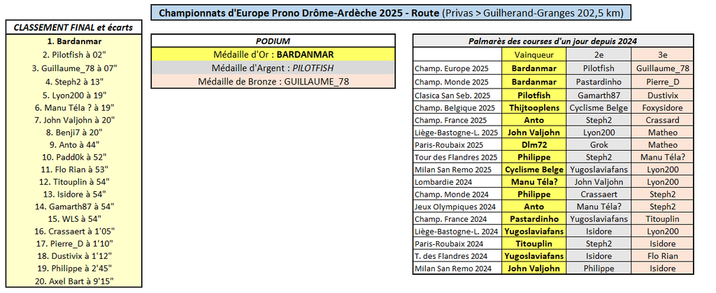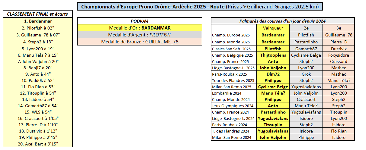 Résultats Championnat d'Europe Drôme-Ardèche 2025 Prono - Route