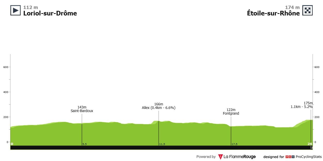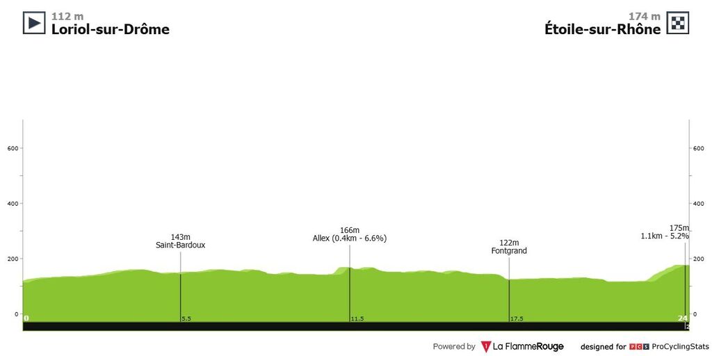 Championnats d'Europe 2025 - Contre la Montre individuel Hommes Loriol-sur-Drôme > Etoile-sur-Rhône 24 km - Contre-la-Montre individuel - D+216m - Premier départ : mercredi 1er octobre à 15h45 --- Coureur n°1 : Coureur n°2 : Coureur n°3 : Coureur n°4 : Coureur n°5 : Coureur n°6 : écart entre 1er et 2e : ----------- Votre chrono du contre-la-montre sera calculé de la manière suivante : temps de votre coureur n°1 + 1/2 temps de votre coureur n°2 + 1/4 temps de votre coureur n°3 + 1/8 temps de votre coureur n°4 + 1/16 temps de votre coureur n°5 + 1/32 temps de votre coureur n°6 x 1/10 nombre de joueurs participants à cette étape (le pronostic sur l'écart entre 1er et 2e ne servira que pour départager les éventuels ex aequo) ----------- Le profil du parcours :