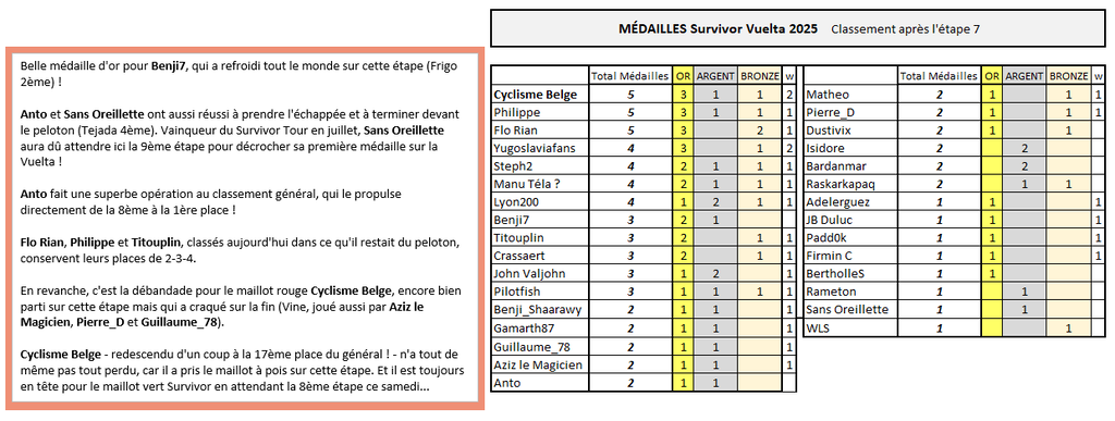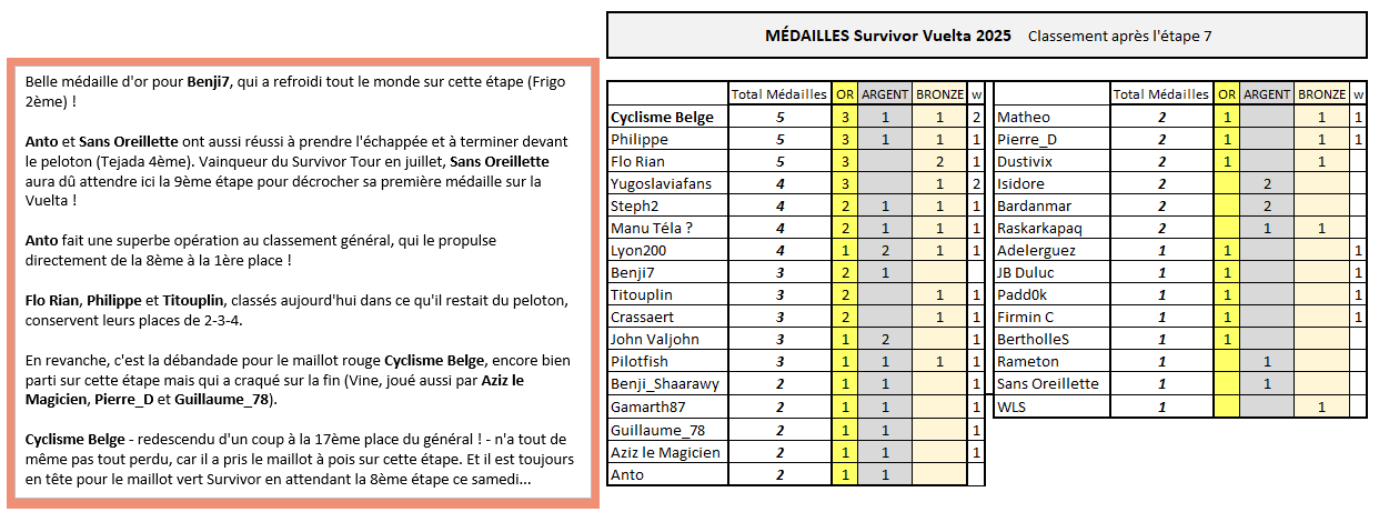 SURVIVOR VUELTA Belle médaille d'or pour Benji7, qui a refroidi tout le monde sur cette étape (Frigo 2ème) ! Anto et Sans Oreillette ont aussi réussi à prendre l'échappée et à terminer devant le peloton (Tejada 4ème). Vainqueur du Survivor Tour en juillet, Sans Oreillette aura dû attendre ici la 9ème étape pour décrocher sa première médaille sur la Vuelta ! Anto fait une superbe opération au classement général, qui le propulse directement de la 8ème à la 1ère place ! Flo Rian, Philippe et Titouplin, classés aujourd'hui dans ce qu'il restait du peloton, conservent leurs places de 2-3-4. En revanche, c'est la débandade pour le maillot rouge Cyclisme Belge, encore bien parti sur cette étape mais qui a craqué sur la fin (Vine, joué aussi par Aziz le Magicien, Pierre_D et Guillaume_78). Cyclisme Belge - redescendu d'un coup à la 17ème place du général ! - n'a tout de même pas tout perdu, car il a pris le maillot à pois sur cette étape. Et il est toujours en tête pour le maillot vert Survivor en attendant la 8ème étape ce samedi...