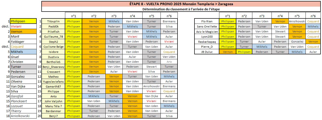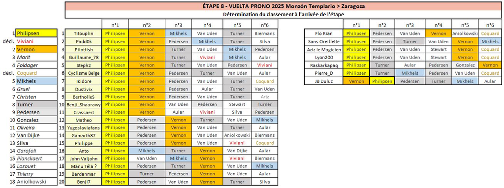 Vuelta Prono & Survivor Vuelta 2025 - Étape 8 : Monzón Templario > Zaragoza 163.5 km - Plat - D+1236 m Départ de l'étape : samedi 30 août à 13h40 --- Coureur n°1 : Coureur n°2 : Coureur n°3 : Coureur n°4 : Coureur n°5 : Coureur n°6 : --- Survivor Étape 08 : ----------- Top coureurs avant cette étape : Les principaux favoris pour le classement général final, par ordre alphabétique : Almeida, Bernal, Ciccone, Gall, Hindley, Jorgenson, O'Connor, Pellizzari, Riccitello, Træen, Vingegaard ----------- -------------------------------------------------------------------- Vos coureurs interdits au jeu Survivor (coureurs déjà joués sur les étapes précédentes) Anto : 1-Van Uden 2-Ayuso 3-Pedersen 4-Aular 5-Ganna 6-Ciccone 7-Tejada Aziz le Magicien : 1-Philipsen 2-Pidcock 3-Aular 4-Pedersen 5-Kuss 6-Ayuso 7-Vine Bardanmar : 1-Pedersen 2-Almeida 3-Turner 4-Philipsen 5-Sheffield 6-Ayuso 7-O'Connor Benji_Shaarawy : 1-Philipsen 2-Langellotti 3-Turner 4-Pedersen 5-Campenaerts 6-Ayuso 7-Dunbar Benji7 : 1- 2-Ciccone 3-Turner 4-Pedersen 5-Jorgenson 6-Ciccone 7-Frigo BertholleS : 1-Van Uden 2-Pidcock 3-Pedersen 4-Ganna 5- 6-Gaudu 7-Vingegaard Crassaert : 1-Philipsen 2-Pidcock 3-Pedersen 4-Aular 5-Ganna 6-Buitrago 7-Ciccone Cyclisme Belge : 1-Philipsen 2-Pidcock 3-Pedersen 4-Vernon 5-Bjerg 6-Almeida 7-Vine Dustivix : 1-Pedersen 2-Ciccone 3-Langellotti 4-Vernon 5-Sheffield 6-Hindley 7-Buitrago Flo Rian : 1-Van Uden 2-Ciccone 3-Pedersen 4-Vernon 5-Bjerg 6-Vingegaard 7-Bernal Gamarth87 : 1-Philipsen 2-Bisiaux 3-Turner 4-Pedersen 5-Jorgenson 6-Ciccone 7-Tiberi Guillaume_78 : 1-Philipsen 2-Pidcock 3-Turner 4-Pedersen 5-Jorgenson 6-Ciccone 7-Vine Isidore : 1-Stewart 2-Langellotti 3-Aular 4-Silva 5-Campenaerts 6-Gaudu 7-Tiberi JB Duluc : 1-Philipsen 2-Pidcock 3-Langellotti 4-Pedersen 5-Ganna 6-Hindley 7-Jorgenson John Valjohn : 1-Philipsen 2-Pidcock 3-Almeida 4-Pedersen 5-Jorgenson 6-Almeida 7-Tiberi Lyon200 : 1-Philipsen 2-Pedersen 3-Aular 4-Van Uden 5-Campenaerts 6-Vingegaard 7-Almeida Manu Téla ? : 1-Zingle 2-Ciccone 3-Aular 4-Turner 5-Ganna 6-Vingegaard 7-Riccitello Matheo : 1-Pedersen 2-Ciccone 3-Fisher-Black 4-Vernon 5-Ganna 6-Ayuso 7-Almeida Padd0k : 1-Philipsen 2-Langellotti 3-Turner 4-Vernon 5-Sheffield 6-Buitrago 7-O'Connor Philippe : 1-Philipsen 2-Ciccone 3-Pedersen 4-Aular 5-Campenaerts 6-Vingegaard 7-Almeida Pierre_D : 1-Philipsen 2-Tiberi 3-Coquard 4-Vernon 5-Sobrero 6-Hindley 7-Vine Pilotfish : 1-Philipsen 2-Pidcock 3-Aular 4-Coquard 5-Sheffield 6-Pellizari 7-Ciccone Rameton : 1-Stewart 2-Lecerf 3-Coquard 4-Ganna 5-Campenaerts 6-Ayuso 7-Jorgenson Raskarkapaq : 1-Coquard 2-Gall 3-Bagioli 4-Kwiatkowski 5-Kung 6- 7-Lecerf Sans Oreillette : 1-Van Uden 2-Pidcock 3-Turner 4-Pedersen 5-Sheffield 6-Buitrago 7-Tejada Steph2 : 1-Philipsen 2-Pidcock 3-Pedersen 4-Vernon 5-Kelderman 6-Gaudu 7-Almeida Titouplin : 1-Philipsen 2-Pidcock 3-Pedersen 4-Frigo 5-Hoole 6-Ciccone 7-Bernal Yugoslaviafans : 1-Philipsen 2-Pidcock 3- 4-Pedersen 5-Soler 6-Castrillo 7-Ciccone