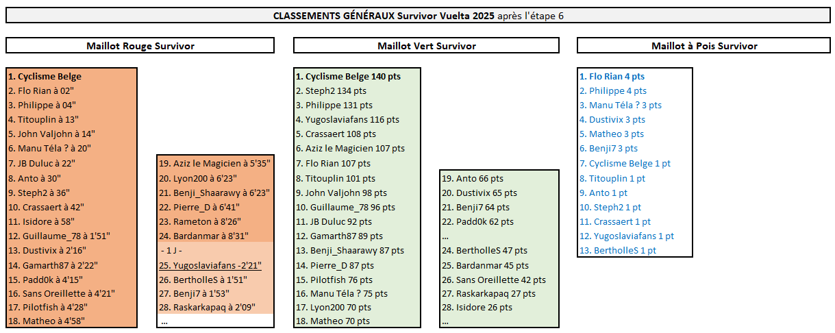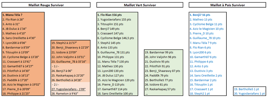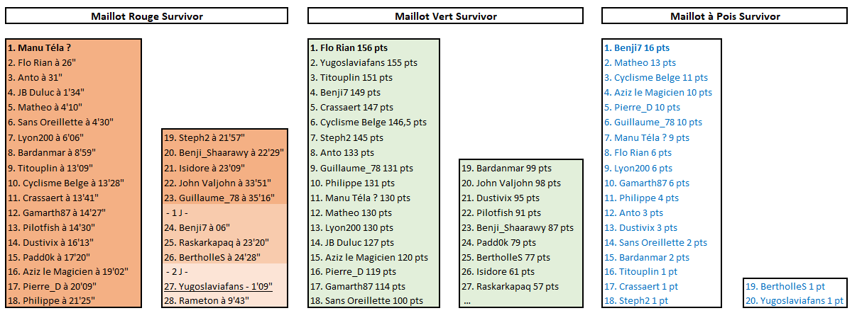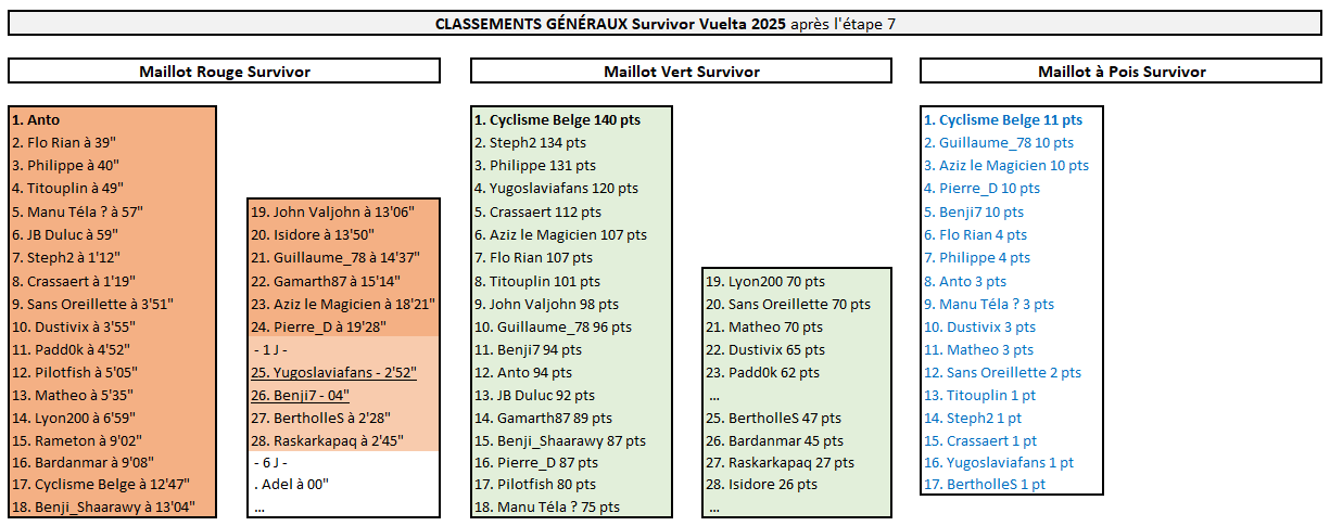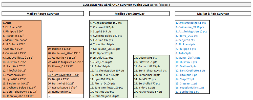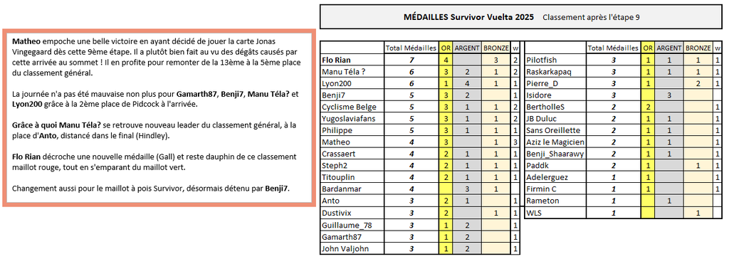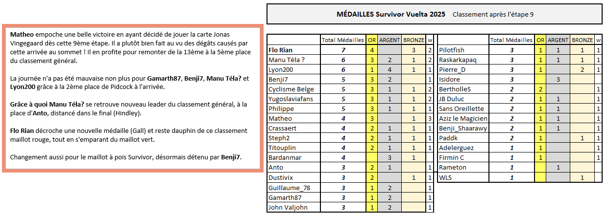 SURVIVOR VUELTA Matheo empoche une belle victoire en ayant décidé de jouer la carte Jonas Vingegaard dès cette 9ème étape. Il a plutôt bien fait au vu des dégâts causés par cette arrivée au sommet ! Il en profite pour remonter de la 13ème à la 5ème place du classement général. La journée n'a pas été mauvaise non plus pour Gamarth87, Benji7, Manu Téla? et Lyon200 grâce à la 2ème place de Pidcock à l'arrivée. Grâce à quoi Manu Téla? se retrouve nouveau leader du classement général, à la place d'Anto, distancé dans le final (Hindley). Flo Rian décroche une nouvelle médaille (Gall) et reste dauphin de ce classement maillot rouge, tout en s'emparant du maillot vert. Changement aussi pour le maillot à pois Survivor, désormais détenu par Benji7. V