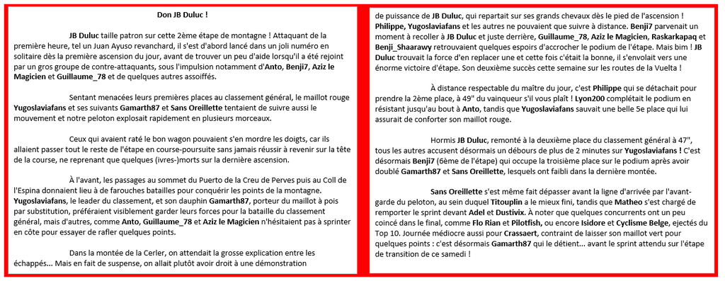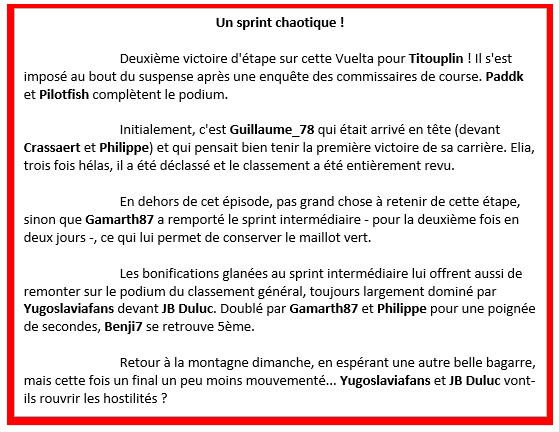 VUELTA PRONO Un sprint chaotique ! Deuxième victoire d'étape sur cette Vuelta pour Titouplin ! Il s'est imposé au bout du suspense après une enquête des commissaires de course. Paddk et Pilotfish complètent le podium. Initialement, c'est Guillaume_78 qui était arrivé en tête (devant Crassaert et Philippe) et qui pensait bien tenir la première victoire de sa carrière. Elia, trois fois hélas, il a été déclassé et le classement a été entièrement revu. En dehors de cet épisode, pas grand chose à retenir de cette étape, sinon que Gamarth87 a remporté le sprint intermédiaire - pour la deuxième fois en deux jours -, ce qui lui permet de conserver le maillot vert. Les bonifications glanées au sprint intermédiaire lui offrent aussi de remonter sur le podium du classement général, toujours largement dominé par Yugoslaviafans devant JB Duluc. Doublé par Gamarth87 et Philippe pour une poignée de secondes, Benji7 se retrouve 5ème. Retour à la montagne dimanche, en espérant une autre belle bagarre, mais cette fois un final un peu moins mouvementé... Yugoslaviafans et JB Duluc vont-ils rouvrir les hostilités ?