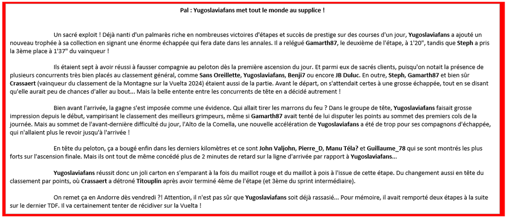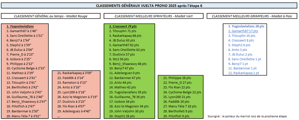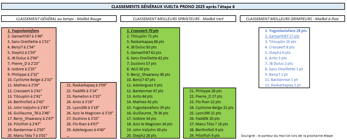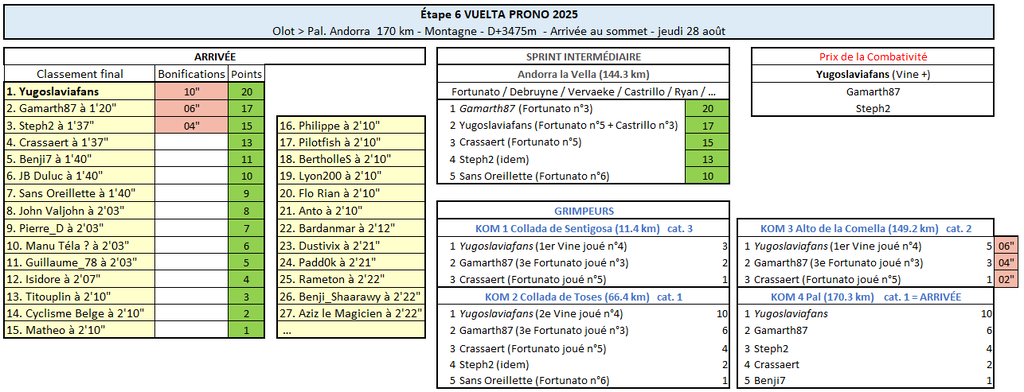 VUELTA PRONO Résultats Étape 6 Vuelta Prono 2025Pal : Yugoslaviafans met tout le monde au supplice ! Un sacré exploit ! Déjà nanti d'un palmarès riche en nombreuses victoires d'étapes et succès de prestige sur des courses d'un jour, Yugoslaviafans a ajouté un nouveau trophée à sa collection en signant une énorme échappée qui fera date dans les annales. Il a relégué Gamarth87, le deuxième de l'étape, à 1'20", tandis que Steph a pris la 3ème place à 1'37" du vainqueur ! Ils étaient sept à avoir réussi à fausser compagnie au peloton dès la première ascension du jour. Et parmi eux de sacrés clients, puisqu'on notait la présence de plusieurs concurrents très bien placés au classement général, comme Sans Oreillette, Yugoslaviafans, Benji7 ou encore JB Duluc. En outre, Steph, Gamarth87 et bien sûr Crassaert (vainqueur du classement de la Montagne sur la Vuelta 2024) étaient aussi de la partie. Avant le départ, on s'attendait certes à une grosse échappée, tout en se disant qu'elle aurait peu de chances d'aller au bout... Mais la belle entente entre les concurrents de tête en a décidé autrement ! Bien avant l'arrivée, la gagne s'est imposée comme une évidence. Qui allait tirer les marrons du feu ? Dans le groupe de tête, Yugoslaviafans faisait grosse impression depuis le début, vampirisant le classement des meilleurs grimpeurs, même si Gamarth87 avait tenté de lui disputer les points au sommet des premiers cols de la journée. Mais au sommet de l'avant-dernière difficulté du jour, l'Alto de la Comella, une nouvelle accélération de Yugoslaviafans a été de trop pour ses compagnons d'échappée, qui n'allaient plus le revoir jusqu'à l'arrivée ! En tête du peloton, ça a bougé enfin dans les derniers kilomètres et ce sont John Valjohn, Pierre_D, Manu Téla? et Guillaume_78 qui se sont montrés les plus forts sur l'ascension finale. Mais ils ont tout de même concédé plus de 2 minutes de retard sur la ligne d'arrivée par rapport à Yugoslaviafans... Yugoslaviafans réussit donc un joli carton en s'emparant à la fois du maillot rouge et du maillot à pois à l'issue de cette étape. Du changement aussi en tête du classement par points, où Crassaert a détroné Titouplin après avoir terminé 4ème de l'étape (et 3ème du sprint intermédiaire). On remet ça en Andorre dès vendredi ?! Attention, il n'est pas sûr que Yugoslaviafans soit déjà rassasié... Pour mémoire, il avait remporté deux étapes à la suite sur le dernier TDF. Il va certainement tenter de récidiver sur la Vuelta !