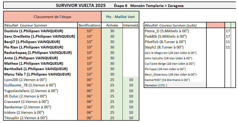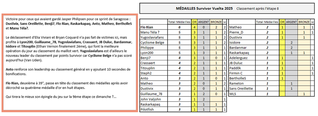SURVIVOR VUELTA Victoire pour ceux qui avaient gardé Jasper Philipsen pour ce sprint de Saragosse : Dustivix, Sans Oreillette, Benji7, Flo Rian, Raskarkapaq, Anto, Matheo, BertholleS et Manu Téla?. Le déclassement d'Elia Viviani et Bryan Coquard n'a pas fait de victimes ici, mais profite à Lyon200, Guillaume_78, Yugoslaviafans, Crassaert, JB Duluc, Bardanmar, Isidore et Titouplin (Ethan Vernon finalement 2ème), qui font la meilleure opération du jour au classement du maillot vert. Yugoslaviafans est d'ailleurs le nouveau leader du classement par points Survivor car Cyclisme Belge n'a pas scoré aujourd'hui (Van Uden). Anto renforce son leadership au classement général en y ajoutant 10 secondes de bonifications. Flo Rian, deuxième à 39", passe en tête du classement des médailles après avoir décroché sa quatrième médaille d'or en huit étapes. Qui tirera le mieux son épingle du jeu sur la 9ème étape ce dimanche ?...