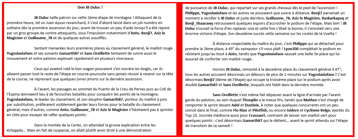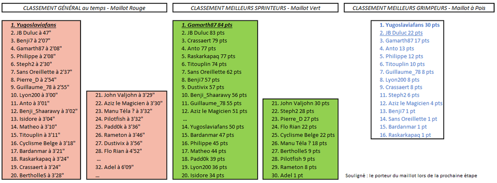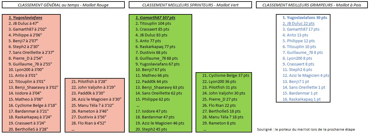 Don JB Duluc ! Taille patron sur cette étape et belle victoire en solitaire devant Philippe, Lyon200, Anto et quelques autres, dont Yugoslaviafans qui conserve le maillot rouge.