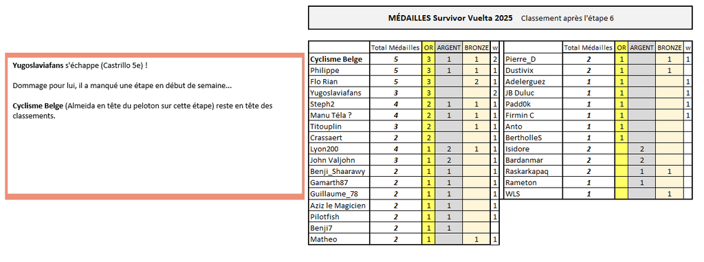 SURVIVOR VUELTA C'est là aussi Yugoslaviafans qui fait la meilleure performance du jour (cette fois grâce à Castrillo) ! Cyclisme Belge reste leader des classements (il passe même en tête au tableau des médailles).