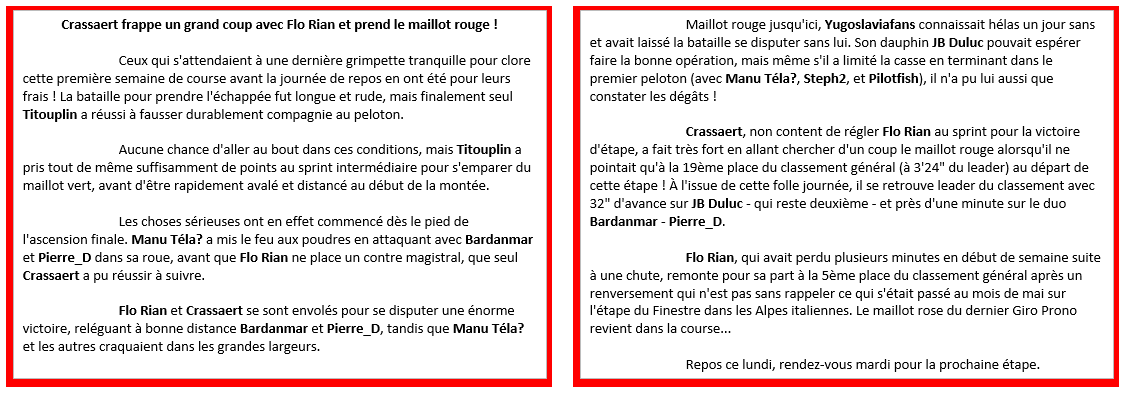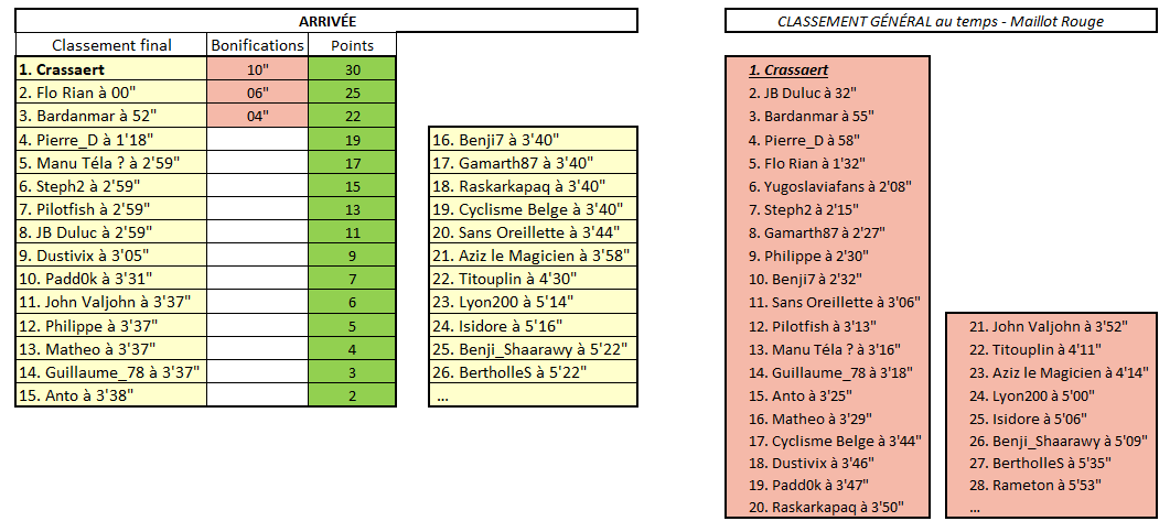 Belle victoire de Crassaert (Vingegaard n°1 + Pidcock n°2) devant Flo Rian (Vingegaard n°1 + Almeida n°2), Bardanmar et Pierre_D Une étape qui va chambouler le classement général ! Résultats détaillés lundi pendant la journée de repos. 1 Crassaert 2 Flo Rian 3 Bardanmar 4 Pierre_D 5 Manu Téla ? 6 Steph2 7 Pilotfish 8 JB Duluc 9 Dustivix 10 Padd0k
