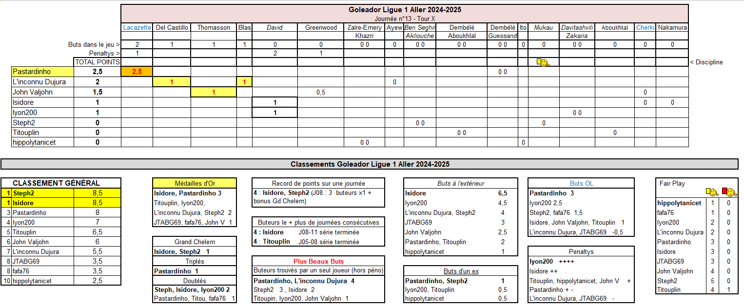 GOLEADOR Pastardinho meilleur score sur cette journée grâce à Lacazette. Premier triplé au Goleador cette saison ! Les deux penaltys marqués par David permettent à Isidore de rejoindre Steph2 (muet ce tour-ci) en tête du classement général, mais Pastardinho se replace juste derrière. lyon200 (David lui aussi) double Titouplin à la 4ème place. Il reste 4 journées à disputer dans cette partie Goleador Matchs Aller et les classements sont toujours aussi serrés !