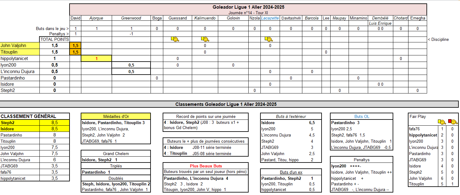 GOLEADOR Le doublé du Lillois Jonathan David contre Brest permet à John Valjohn et Titouplin de se classer en tête de cette journée, devant hippolytanicet (Ajorque vs Lille). C'est de plus en plus serré en tête du classement général à trois journées de la fin de ces matchs aller ! Steph2 et Isidore restent en tête, même s'ils n'ont pas marqué ce tour-ci. Mais ils ne comptent que 0,5 pt d'avance sur Pastardinho et Titouplin, 1 pt d'avance sur lyon200 et John Valjohn et 2,5 pts sur L'inconnu Dujura... Faites vos jeux, rien ne va plus !