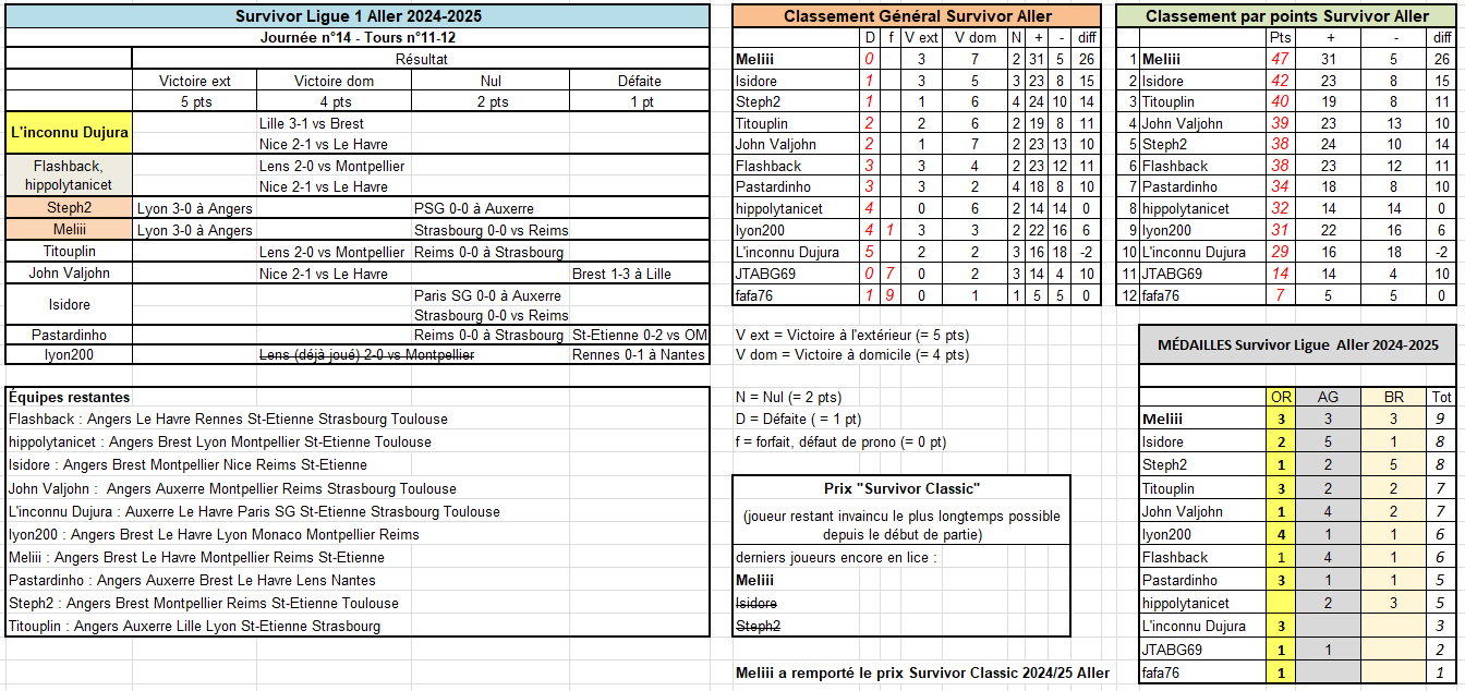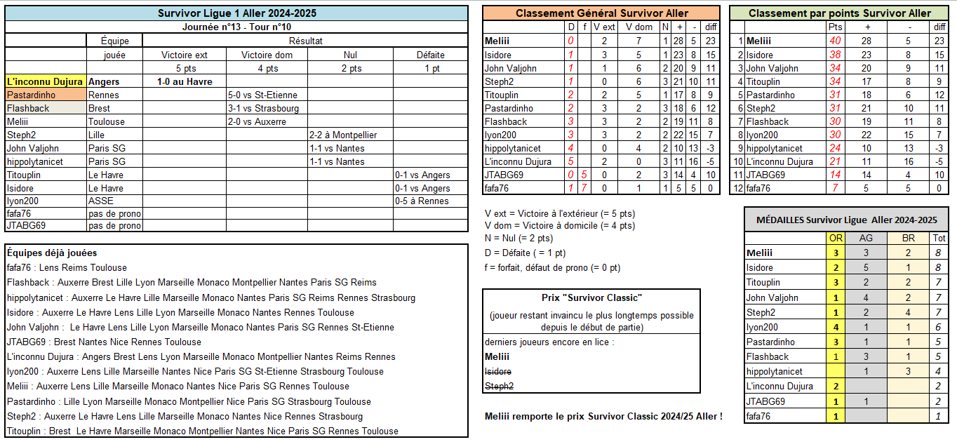 SURVIVOR L'inconnu Dujura décroche la seule victoire à l'extérieur ce tour-ci (Angers au Havre). Ce match a coûté sa première place à Isidore, qui connaît là sa première défaite de la saison. Meliii (victoire de Toulouse à domicile) reste la seule invaincue jusqu'ici, c'est elle qui remporte le Prix SURVIVOR CLASSIC. Bravo ! Meliii est en tête de touts les classements à 4 journées de la fin de ce Survivor Aller.