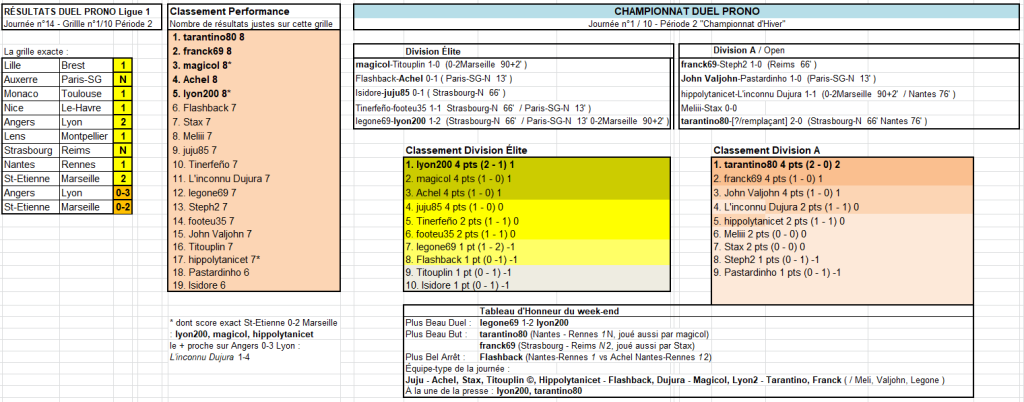 L'inconnu Dujura jeu 20:24 Lille - Brest 1 Auxerre - Paris-SG 12 Monaco - Toulouse 1 Nice - Le-Havre 1 Angers - Lyon 2 Lens - Montpellier 1 Strasbourg - Reims 12 Nantes - Rennes 12 St-Etienne - Marseille N2 + score Angers - Lyon 1-4 + score St-Etienne - Marseille 2-3 ------------- Vos 2 équipes Survivor J14 (il faut donner 2 équipes désormais) : Lille, Nice ------------- Vos 3 Buteurs Goleador J14 : Lacazette, Greenwood, Barcola