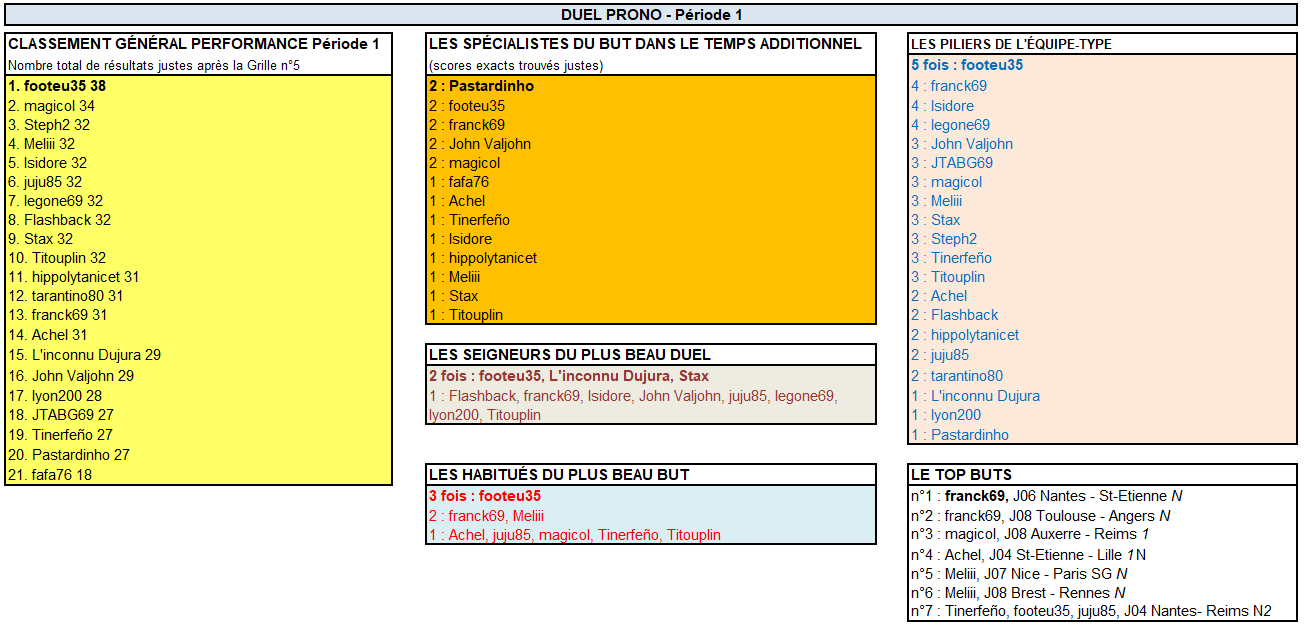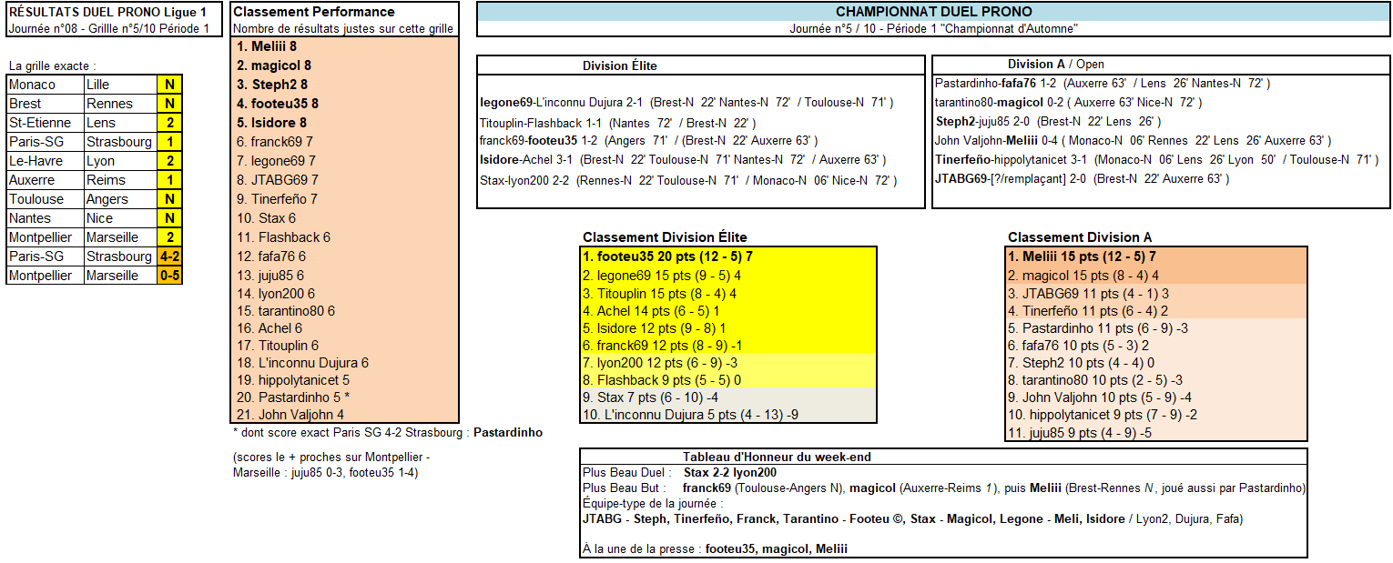 DUEL PRONO Meliii, magicol, Steph2, footeu35 et Isidore ont été les meilleurs performeurs sur cette grille avec 8 bons résultats. footeu35 poursuit donc sur sa lancée, il continue son sans-faute en Élite (2-1 vs franck69) et compte désormais 5 pts d'avance sur legone69 et Titouplin. En tête de Division A, Meliii et magicol confirment et tentent l'échappée.