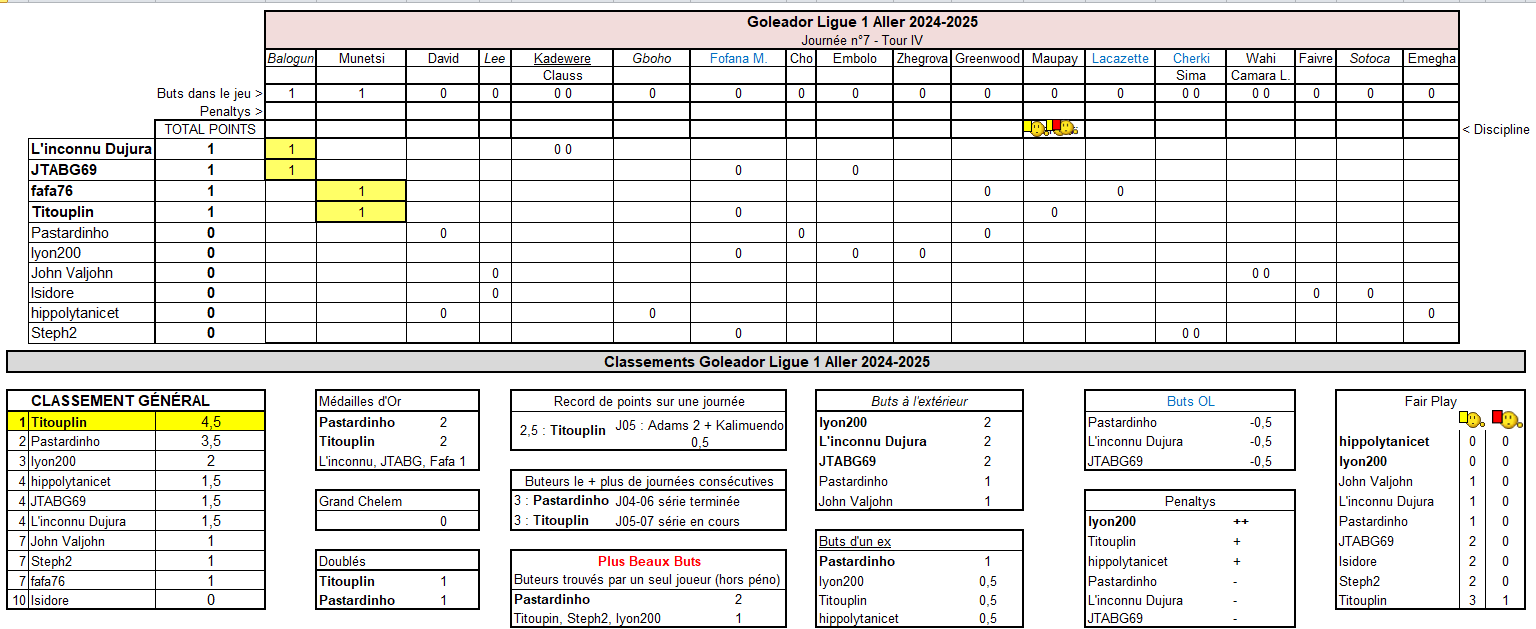 GOLEADOR Médailles ce tour-ci pour tous ceux qui ont trouvé une victoire à domicile, notamment fafa76 (Reims 4-2), JTABG69, Titouplin (Brest 2-0) et John Valjohn (Lyon 2-0). Pastardinho concède un nul (Marseille) qui lui coûte la 1ère place. Meliii (Lille 2-1) repasse en tête au Classement général comme au classement par points, tout en rattrapant lyon200 (Auxerre battu à Saint-Etienne) en haut du tableau des médailles.