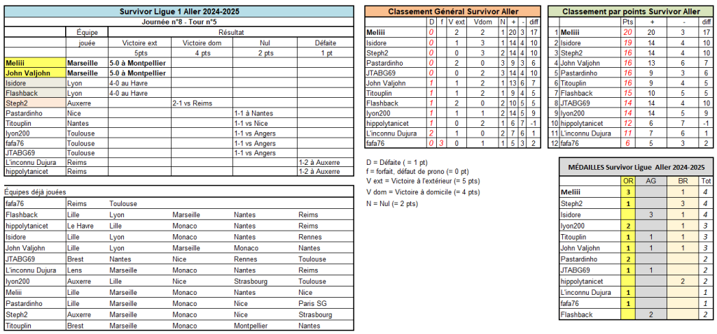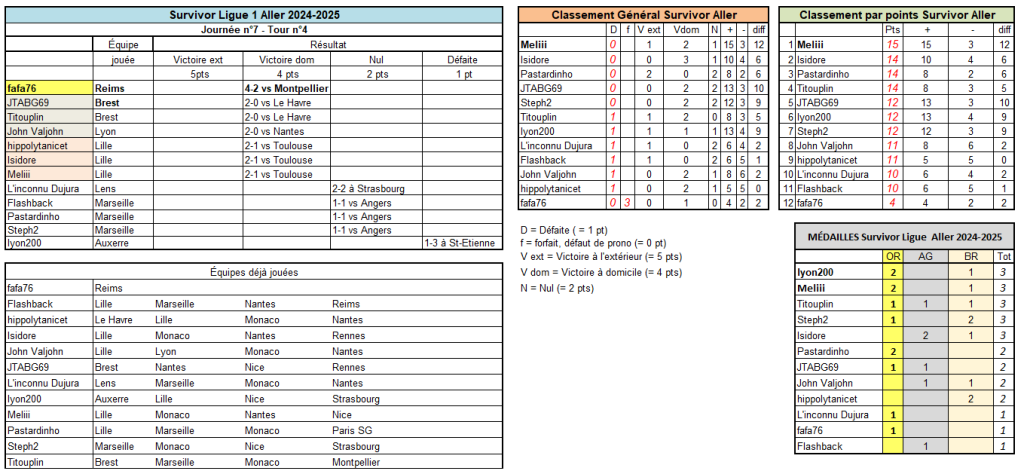 SURVIVOR Victoires à l'extérieur pour lyon200 et Pastardinho (Lille) et pour Flashback (Reims), qui font la meilleure opération du week-end. Pastardinho passe même en tête des classements en profitant des contre-performances de Meliii, Isidore (Nantes) et Titouplin (Marseille). Bien classés pour la 3ème journée de suite, lyon200 et Steph2 sont en tête au nombre de médailles.